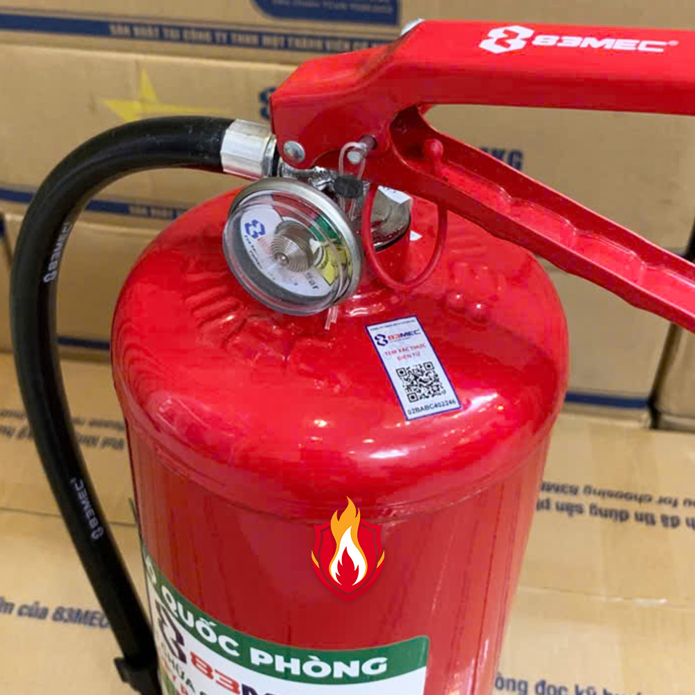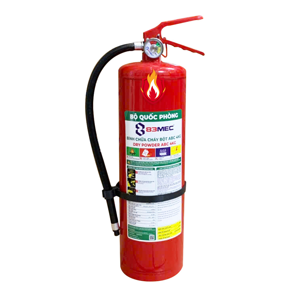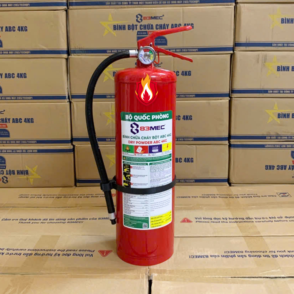 Bình chữa cháy bột ABC 4kg Bộ Quốc Phòng, Tem Kiểm định, được sản xuất bới 83MEC – Đơn vị trực thuộc TCCNQP – Bộ Quốc Phòng là một trong những thiết bị phòng cháy chữa cháy thiết yếu, được thiết kế để dập tắt nhanh các đám cháy do chất rắn (gỗ, vải, giấy…), chất lỏng dễ cháy (xăng, dầu, cồn…) và chất khí (gas, LPG…) gây ra.